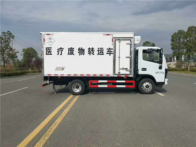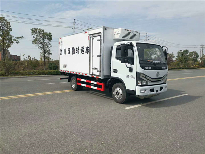 該車采用東風(fēng)多利卡D6柴油平頭醫(yī)療廢物廂式運(yùn)輸車,朝柴發(fā)動機(jī)130馬力國六排放標(biāo)準(zhǔn),帶方向助力,6檔變速箱700綱絲胎,氣剎帶前盤式剎車,ABS,限速裝置,廂體采用外飾玻璃綱內(nèi)飾不銹鋼中間4公分保溫層制作,廂內(nèi)頂部安裝紫外線滅菌燈,配電動噴霧消毒桶一個,安裝零下零度至零下5度冷藏機(jī)組。