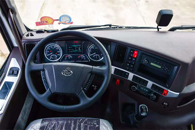 其它配置:液壓機(jī)械翻轉(zhuǎn)、機(jī)械減震司機(jī)座椅、自動(dòng)空調(diào)、定速巡航系統(tǒng)、ABS、車載終端、中控鎖、自動(dòng)調(diào)整臂、多態(tài)開關(guān)、真皮多功能方向盤、前置排氣管、前輪防爆胎裝置、盤式前橋、排氣火花熄滅器、ECU限速裝置(限速80km/h)、駕駛室電源總開關(guān)、導(dǎo)靜電橡膠拖地帶。