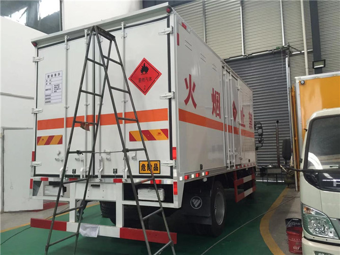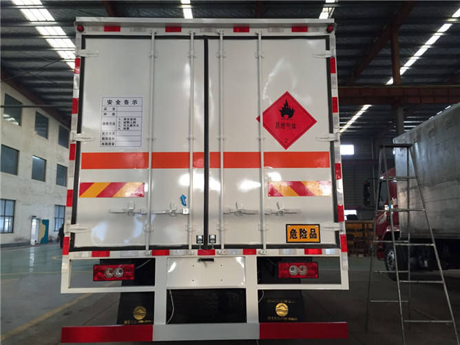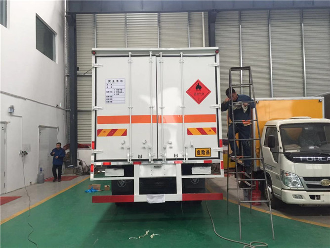 氣瓶運(yùn)輸車必須采用危險品運(yùn)輸專用底盤,排氣管前置,廂體內(nèi)部安裝有易燃?xì)怏w泄漏報警器,廂體外表面貼有防爆標(biāo)識,可以提醒大家注意與危險品運(yùn)輸車輛保持安全間距。