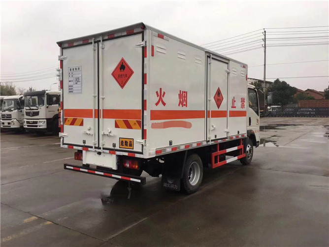 氣瓶運輸車主要用于運輸具有獨立容器(瓶)包裝的易燃氣體(罐(瓶)裝壓縮氫、液化石油氣),類項號為2.1和非易燃無毒氣體(罐(瓶)裝二氧化碳、氧氣、氮氣、氬氣),類項號為2.2。廂體外部按國家標準配置設警示標志,廂體兩側安裝可燃氣體標志,帶“燃”字樣,駕駛室頂部安裝危險三角牌,車身側門及后部粘貼橙色反光標識和菱形標識。