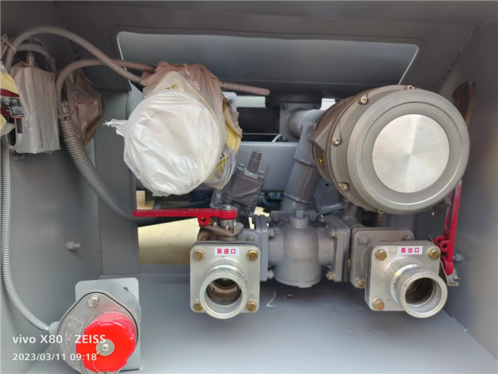 它的容積為1.9立方,采用Q235優(yōu)質(zhì)碳鋼板材,標(biāo)配大流量油泵(可泵進(jìn)泵出),標(biāo)配通倉帶歐標(biāo)全套下裝油系統(tǒng)(含1個(gè)下裝卸油閥、1個(gè)油氣回收閥、1個(gè)油氣回收接口、1套氣動(dòng)組合開關(guān)、1個(gè)防溢流探桿和1個(gè)插座),一只歐標(biāo)罐蓋,一個(gè)海底閥,罐體頂部兩側(cè)帶折疊升降防護(hù)欄,標(biāo)配顏色灰色,罐體兩側(cè)正中貼3M-1級橙色反光帶,貼三個(gè)“易燃液體”標(biāo)識,安全告示牌,合適位置安裝一只工具箱。
