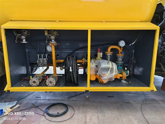 該車罐體采用Q345R材質(zhì)生產(chǎn),直徑為2100毫米,筒體厚度12毫米,封頭厚度為14毫米,配置泵、流量計(jì)、安全附件如溫度計(jì)、壓力表、安全閥、緊急切斷閥等必要設(shè)備。從圖片可以看出,液相和氣相球閥與流量計(jì)一起安裝在車輛的左側(cè),且高度適宜,方便客戶進(jìn)行裝卸作業(yè)。