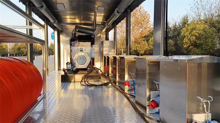 廂體部分:采用一體化鋼體結(jié)構(gòu)設(shè)計(jì)廂體,具備運(yùn)輸、防雨、防火、阻燃、防塵、防銹、降噪、隔震等功能。移動(dòng)電源系統(tǒng)匹配東風(fēng)康明斯250kw發(fā)電機(jī)組及智能控制系統(tǒng),并可對(duì)外輸出220V/380V電壓。搭載8臺(tái)便攜式軸流潛水泵,單臺(tái)排量500立方/小時(shí)。4套一拖二水泵控制系統(tǒng),可視化操作界面,實(shí)施監(jiān)測(cè)運(yùn)行數(shù)據(jù)。4套液壓支撐系統(tǒng),單套靜載荷6噸。車(chē)頂升降照明燈一套,遙控距離25米,升降高度2.5米。野外休息室一套,配備頂部空調(diào)、長(zhǎng)形座椅、工作臺(tái)、飲水機(jī)等生活保障設(shè)備。