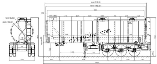 此款瀝青半掛車理論容積:33立方,充裝容積:32.5立方。瀝青介質(zhì)密度:0.9噸/立方,核載29.25噸。罐體尺寸:保溫前9790*2100mm,保溫后9950*2260mm,整車尺寸:10500*2500*3850mm,罐體內(nèi)6道防波板、一根6寸加熱管,尾部罐底1只6寸緊急切斷閥,尾部左右4寸自流口出口,罐頂右側(cè)單邊走道,帶舉升護(hù)欄,后爬梯。