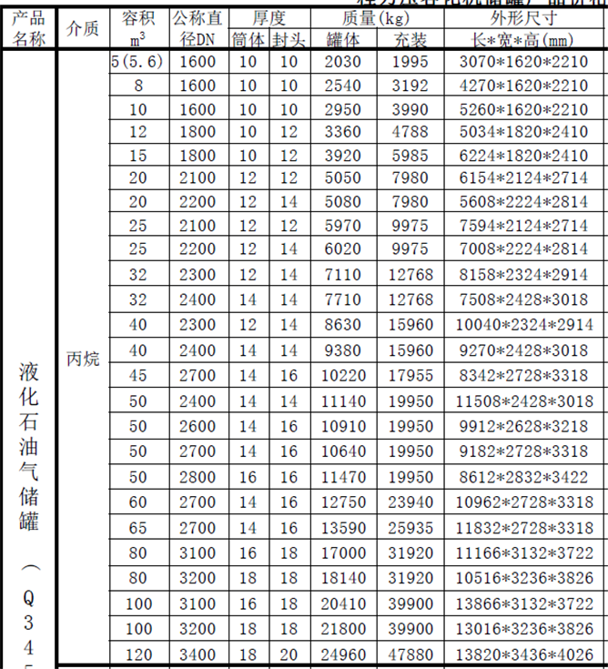 由上表看出,同一種容積規(guī)格的液化氣儲罐一般根據(jù)直徑不同有好幾個(gè)型號,用戶可根據(jù)實(shí)際場地的尺寸和成本來綜合考慮抉擇。并且主要以臥式儲罐為主,立式儲罐使用的較少,也可按您的要求定制。