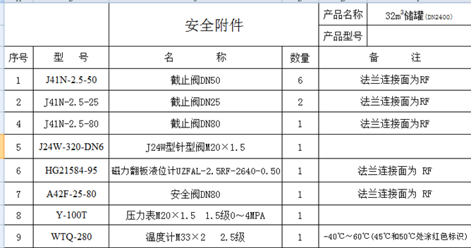 32立方液化氣儲(chǔ)罐在一些小型液化氣站中經(jīng)常用到,安全附件每年要校驗(yàn),不合格的將需要更換,有的液化氣站老板對(duì)其不是很熟悉,容易買(mǎi)錯(cuò),以下為其安全附件清單,方便您參考。