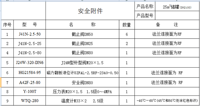 25立方液化氣儲罐是一種常見的規(guī)格型號,根據(jù)市場需求設(shè)計成直徑2100mm的居多,有的液化氣站用2個或者3個25立方的儲罐貯存LPG,經(jīng)濟實惠,管理也方便。以下為按直徑2100mm的配置制定的安全附件清單,供客戶們參考使用。