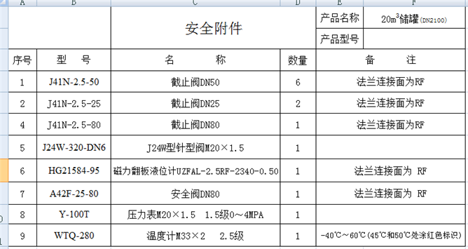20立方液化氣儲罐是一種大眾的規(guī)格,國內(nèi)很多地方如江西好多液化氣站就是搭配2個20立方液化氣儲罐和1個5立方的小罐裝殘液,安全附件沒有儲罐的使用壽命長,經(jīng)常要更換,以下為按直徑2100mm的標準配置制定的20方儲罐安全附件清單,供您參考。
