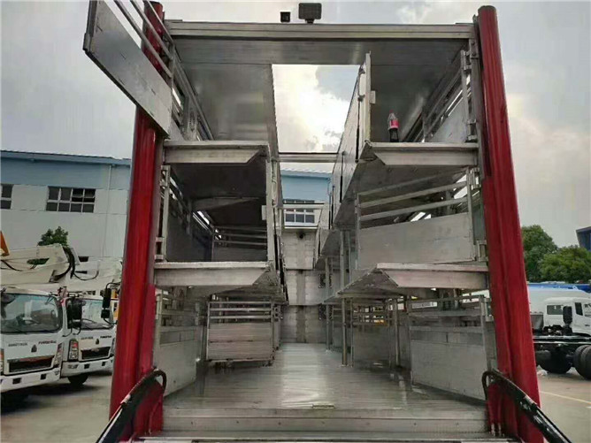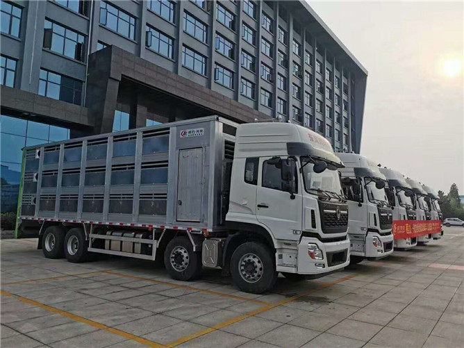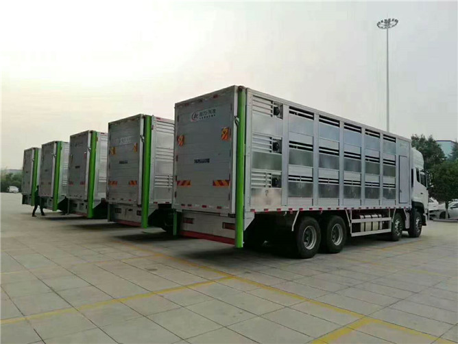 據(jù)悉,此70臺(tái)高端畜禽運(yùn)輸車箱體采用全鋁合金制作,主要有東風(fēng)天錦全鋁合金運(yùn)豬車(三層成豬70~75頭,四層幼豬750~800頭)和東風(fēng)天龍前四后八全鋁合金運(yùn)豬車(三層成豬110~120頭,四層幼豬1200~1250頭)兩種規(guī)格。整車標(biāo)配噴淋、喂食、監(jiān)控、混合隔倉、垂直升降尾板、保溫機(jī)組。有效減少臟亂差,細(xì)菌飛散,保護(hù)環(huán)境,增加畜禽成活率。